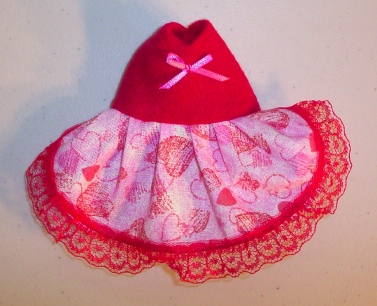 These little dresses are made in a variety of ways. This one is a Heart Print with a Red polar fleece top complete with a little Pink Bow and Red lace trim.