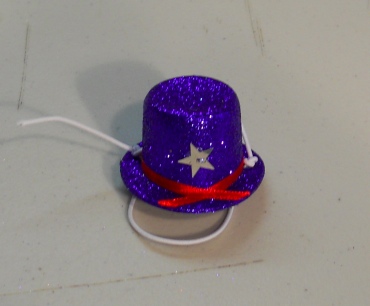 This is cute and even cuter with a rat head under it. It is a BLUE GLITTER TOP HAT. It stays on the ratties head with elastic. The elastic is left long when it arrives to you so that you can cut it or tuck it to fit your own rattie. If you have a dark colored rattie, use a permanent marker to color the elastic. Just let it dry well before putting the hat on the rat.