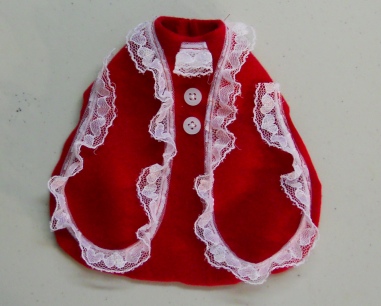 These little coats are made in a variety of ways. This one is a Cute Little Red Coat with Fancy White Lade and a White Lace Old English Neck Tie. The Coat also has two little White Button sewed on for fun. I wish the photos showed the outfits better then they do.