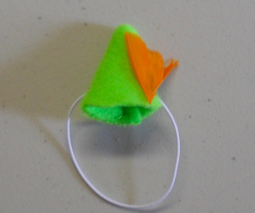This is cute and even cuter with a Guinea Pig head under it. It is a Cavy sized Lime Green with Bright Orange Feathered hat. It stays on your pet's head with elastic. The elastic is left long when it arrives to you so that you can cut it or tuck it to fit your own Guinea Pig. If you have a dark colored Guinea Pig, use a permanent marker to color the elastic. Just let it dry well before putting the hat on your pet.