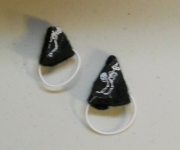 The hat stays on the animal's head with adjustable elastic. I left the elastic long so that you can move the knot to fit your animals. You can also color the elastic with permanent marker to darken it for darker colored pet.