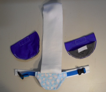 The Diaper Holder is held on, or holds together, with a small high impact plastic buckle and slide, backed with polar fleece. Once set to size it will stay put. It makes this Goose Diaper Holder very comfortable and secure for the goose wearing it with no big bulky or shiny parts.