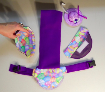 The Diaper Holder is held on, or holds together, with a small high impact plastic buckle and slide, backed with polar fleece. Once set to size it will stay put. It makes this Goose Diaper Holder very comfortable and secure for the goose wearing it with no big bulky or shiny parts.