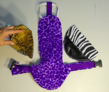 This Duck Diaper Holder Harness is made with THREE DIFFERENT FUN JUNGLE PRINTS ALL MATCHING matching w/two removable diaper inserts , backed with a waterproof fabric and it is oh so cute. This Duck Diaper Holder can be lined with a sanitary napkin, a human baby diaper, a folded newspaper page or other folded papers such as paper towels or other papers to be recycled.
