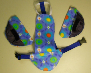 The Diaper Holder is held on, or holds together, with a small high impact plastic buckle and slide, backed with polar fleece. Once set to size it will stay put. It makes this Goose Diaper Holder very comfortable and secure for the goose wearing it with no big bulky or shiny parts.