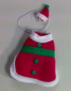 These little coats are made in a variety of ways. These little outfits are so cute, I wish the photos showed the outfits better then they do. This is a cute little Gerbil or Hamster Green Highlighted Santa Suit with matching Hat! The Hat stays on the pets head with adjustable elastic. The photos best describe the outfit.