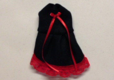These little dresses are made in a variety of ways. These little outfits are so cute, I wish the photos showed the outfits better then they do. This one, looks way better in person, and it is Hand Crafted using Black Polar Fleece with Red Lace and a Cute Little Bitty Red Bow.