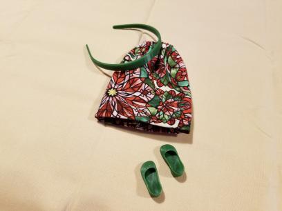 With this lot you will receive what you see in the photo. The LOVELY Stained Glass Print Skirt, the matching Pair of Forest Green Shoes (that click on from the little toe over and STAY on the foot!) as well as the Forest Green Headband.