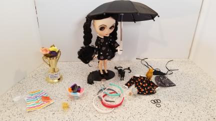 This is a Photo of my Custom Blythe Wednesday Addams at the Event in Chicago, PUDDLE Doll Show. She took 2nd Place, I believe there were eight entries.