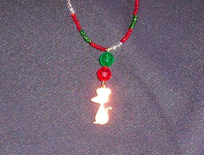 WEAR THIS NECKLACE TO SHOW YOUR LOVE OF RATTIES FOR THE HOLIDAYS. THIS NECKLACE IS APPROX. 18" LONG WITH SEED BEADS (that is not the size, just the type of beads used) The charm is approx 1" tall and is a copper colored mouse/rattie.